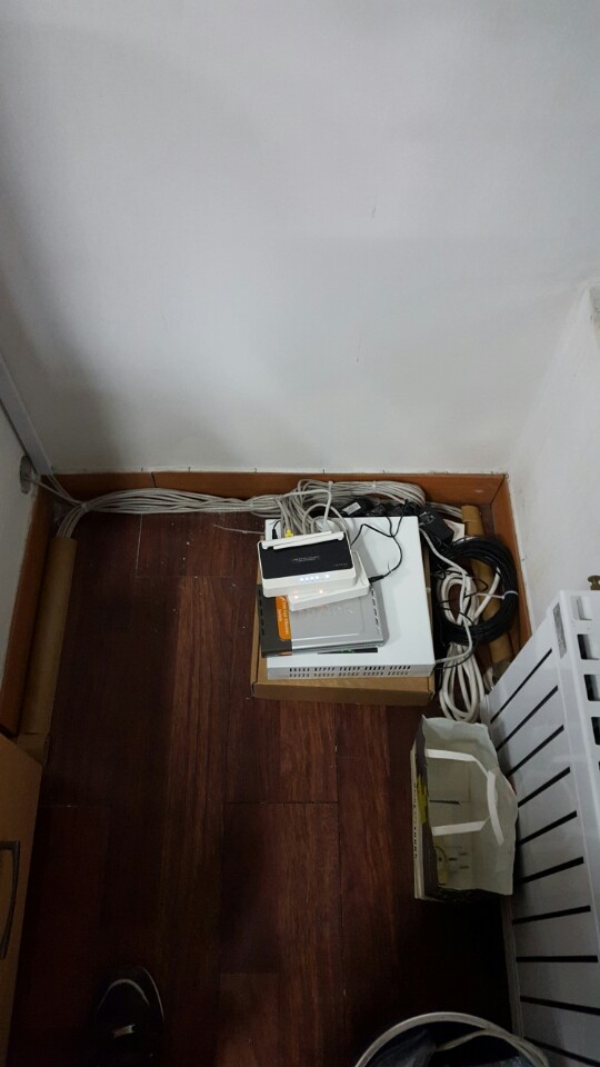벽면과 바닥에 노출된 랜선을 흰색과 갈색몰딩을 이용하여